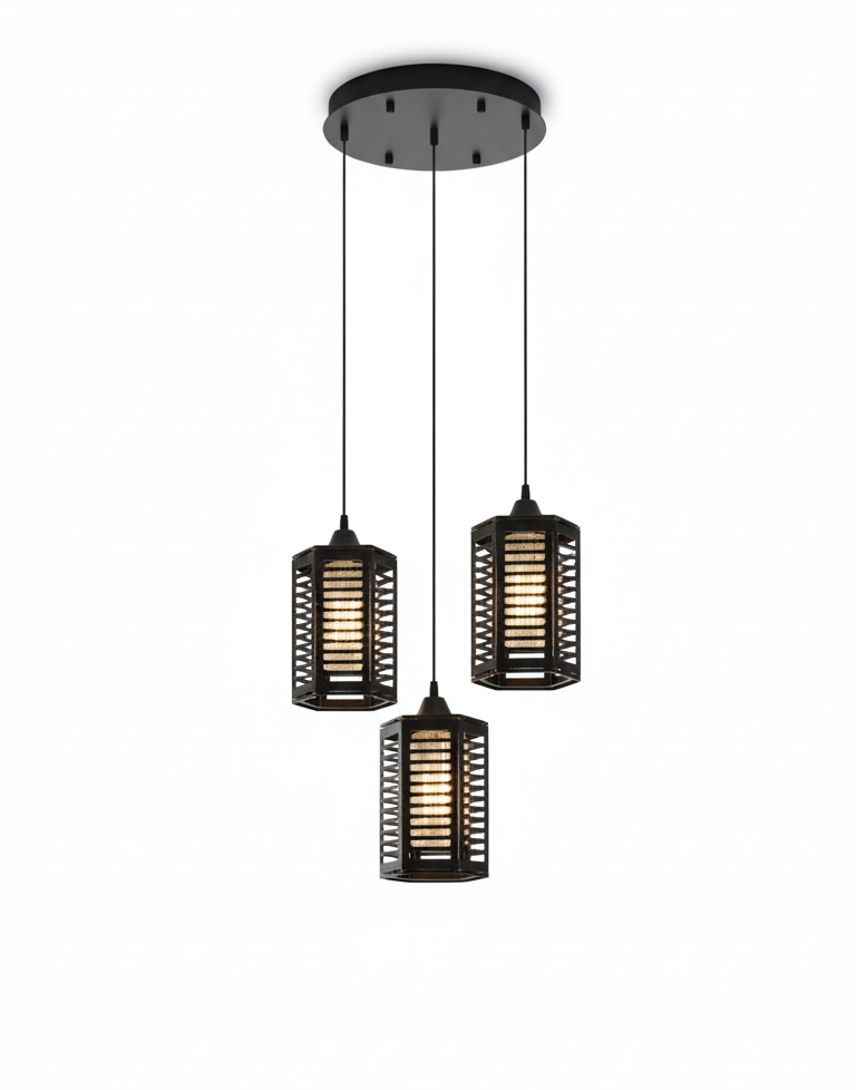 Modern triple pendant light with geometric black cages, perfect for adding a stylish industrial touch to dining or living spaces.