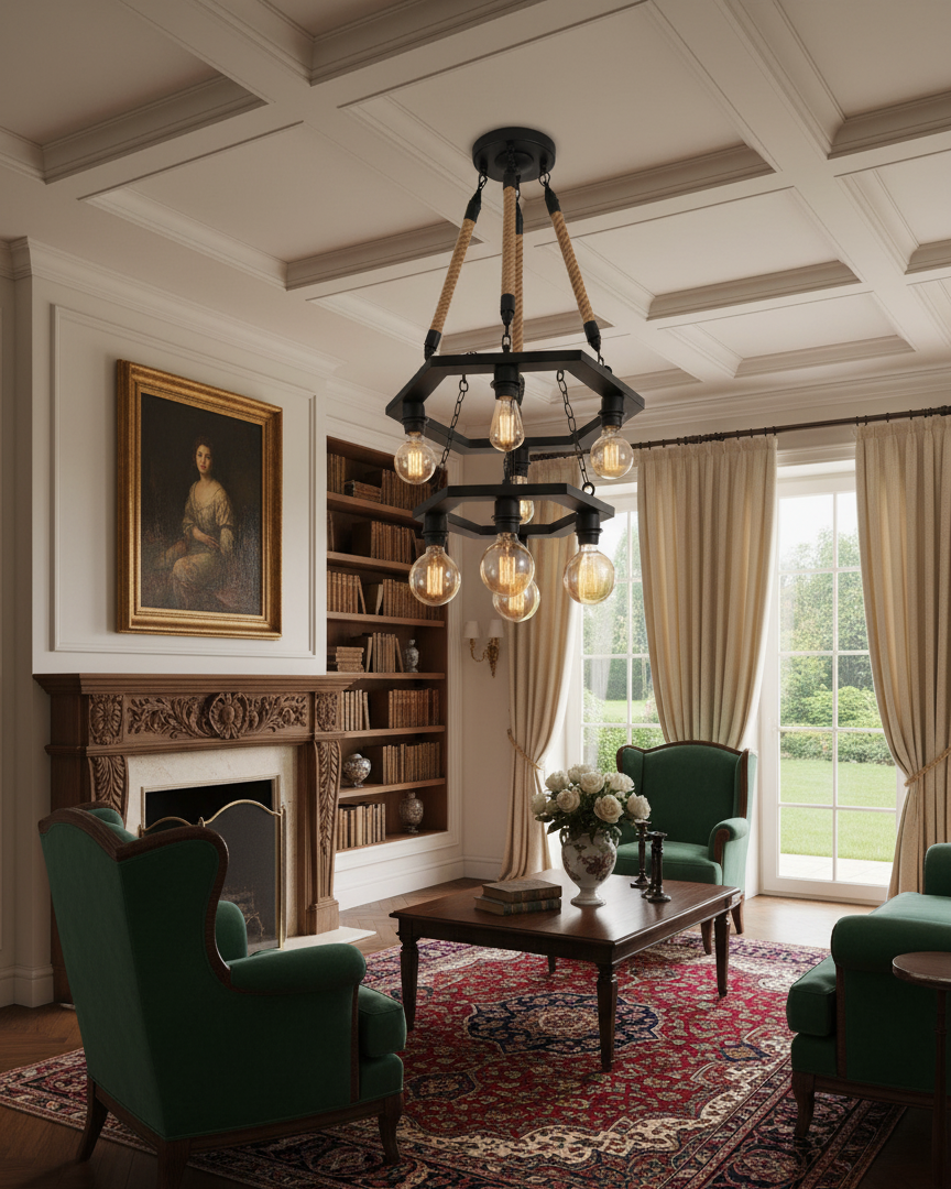 A modern industrial chandelier featuring two hexagonal black metal frames suspended by rustic rope and chains.