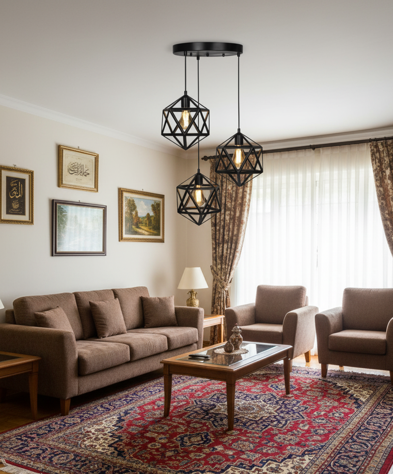 A modern industrial pendant light featuring three geometric metal cage shades in a matte black finish.