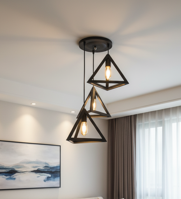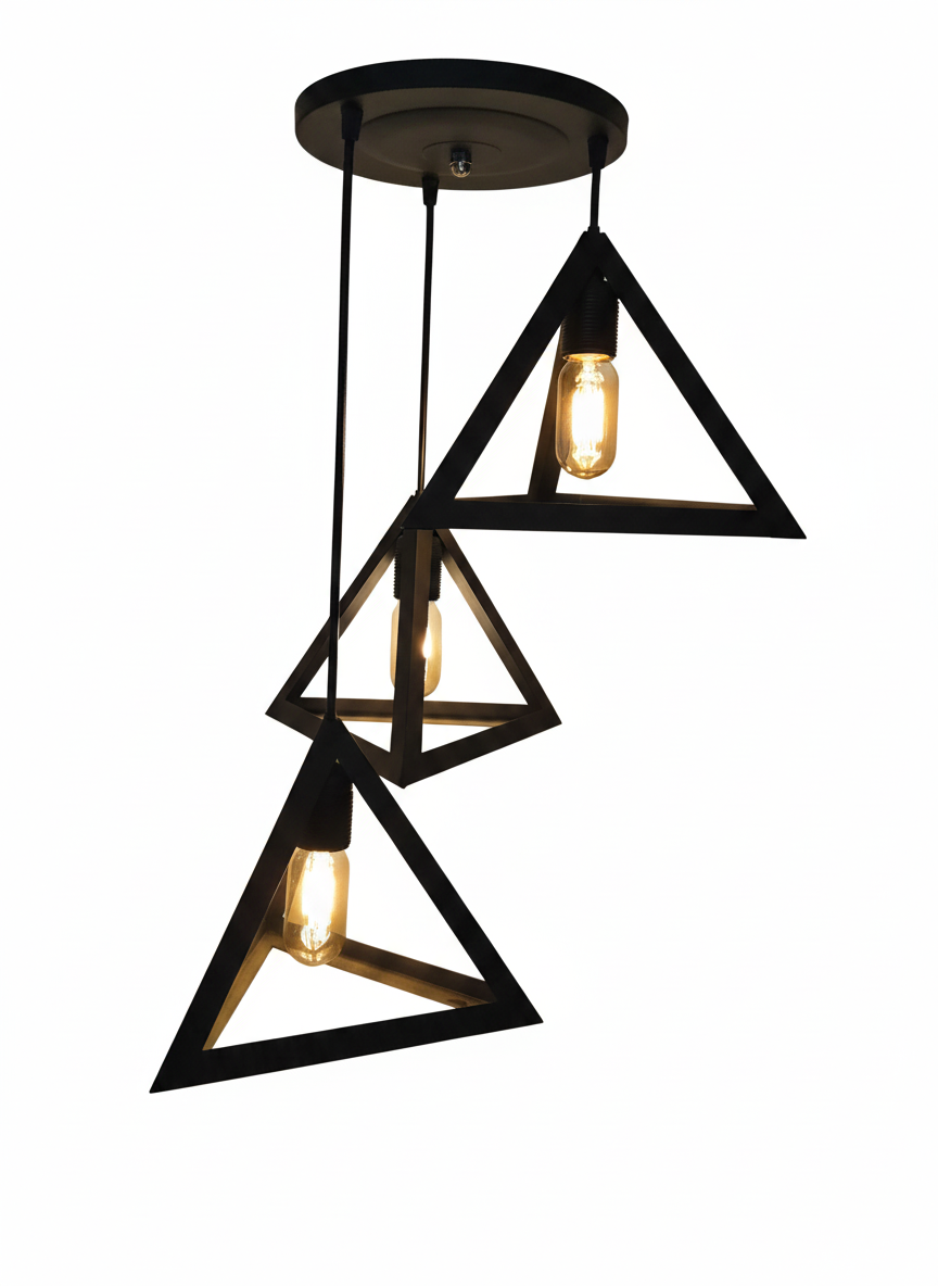 Modern geometric pendant light featuring three triangle frames with warm glowing bulbs, creating a stylish and artistic ceiling design.