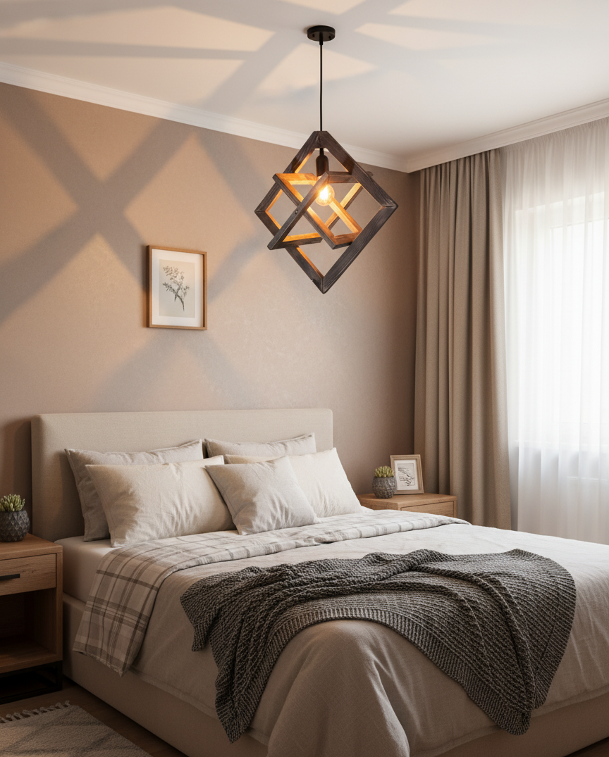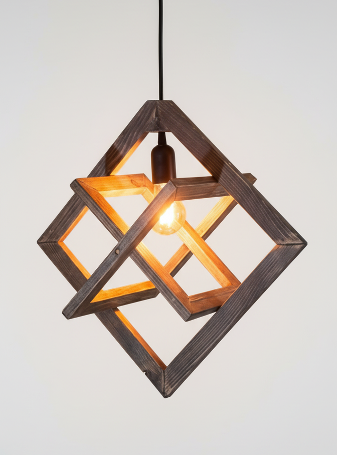 This geometric wooden pendant light features an intersecting cube design that beautifully frames a glowing bulb.