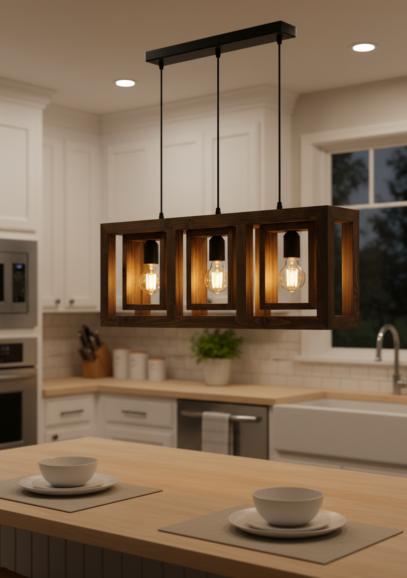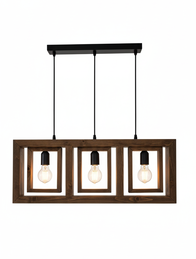 A contemporary pendant light featuring three exposed bulbs suspended within rectangular wooden frames. The design combines black metal fixtures and warm wood tones, creating a stylish balance between industrial and rustic aesthetics — ideal for dining areas, kitchens, or modern interiors.